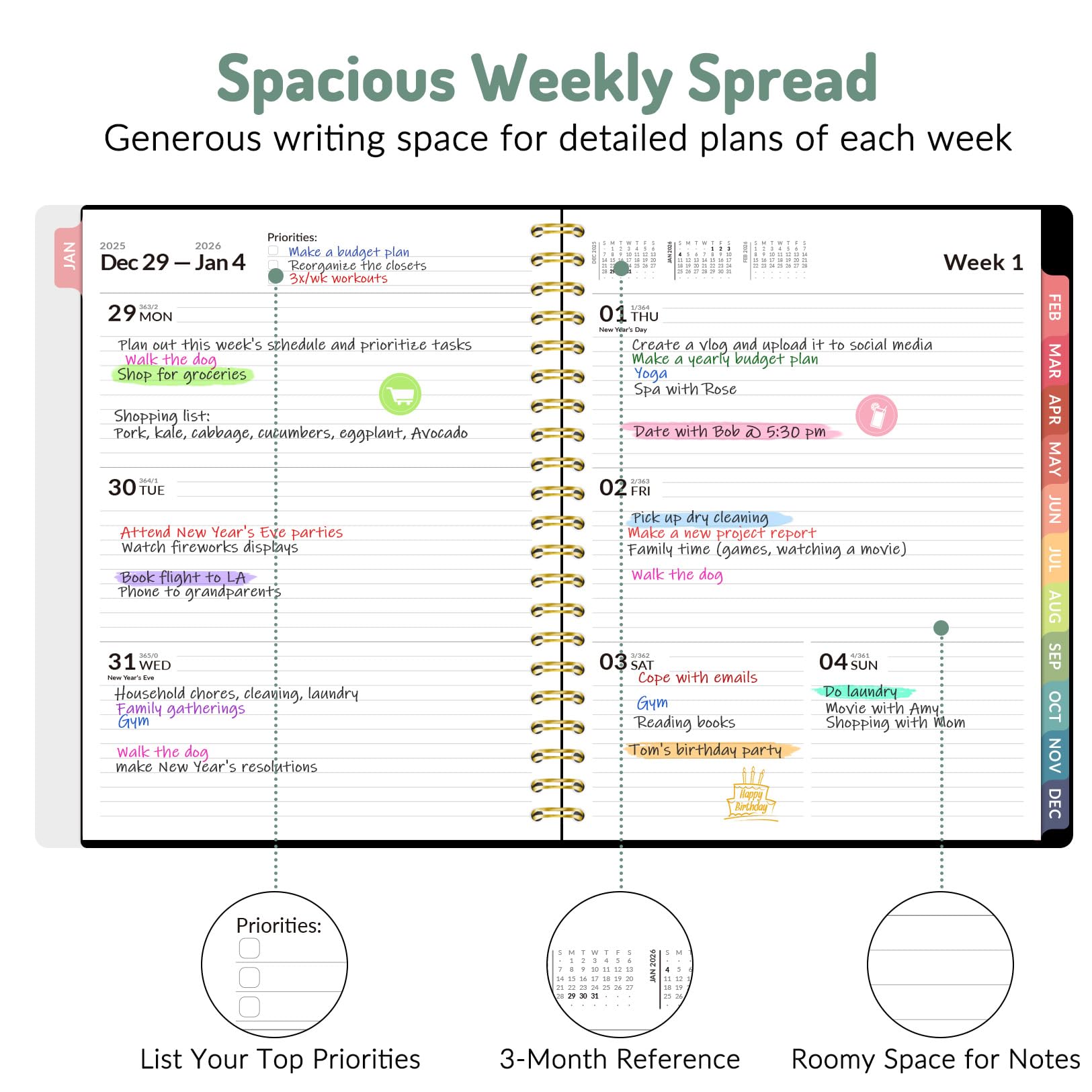 2026 Planner Overview: Come with 12 months (January 2026 to December 2026) of monthly and weekly pages. This planner features a simplified layout for ease of use, offering spacious writing space to plan your schedule freely. Absolutely an effective time management tool to keep track on your daily tasks. 3 additional monthly pages (Oct 2025 - Dec 2025) are included