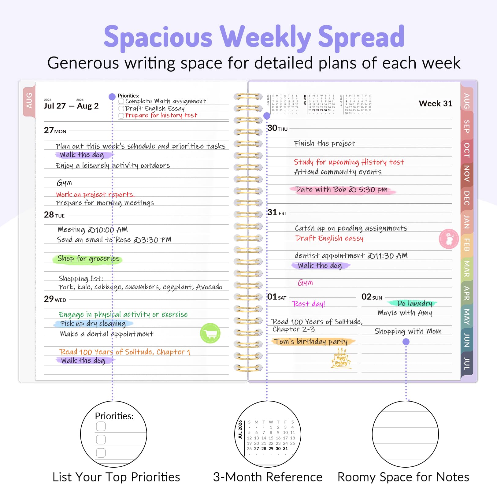 Spacious Writing Space: Printed on 6.3" x 8.4" quality paper, an agenda planner has plenty of room to write assignments and track homework. Perfect size for use on your desk.