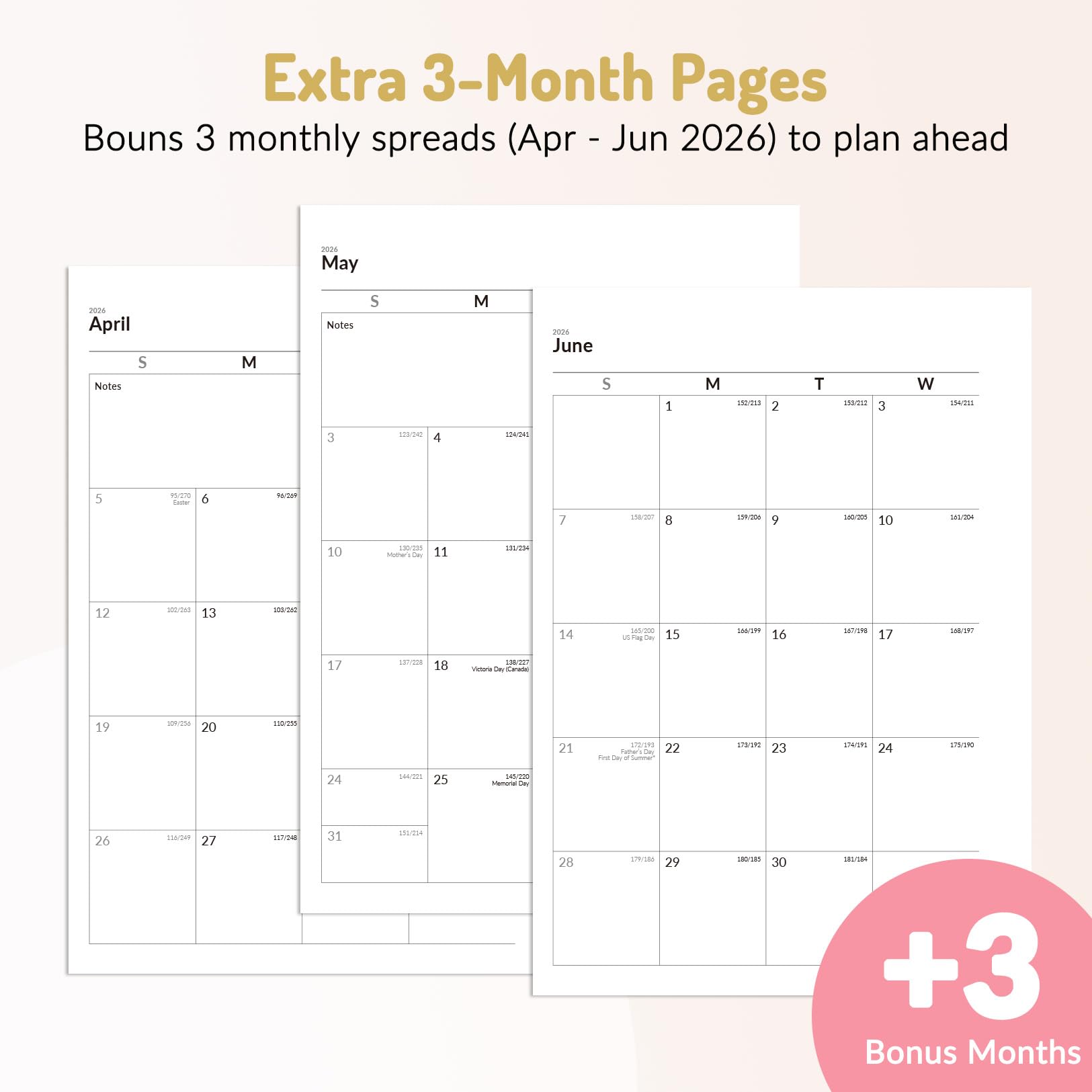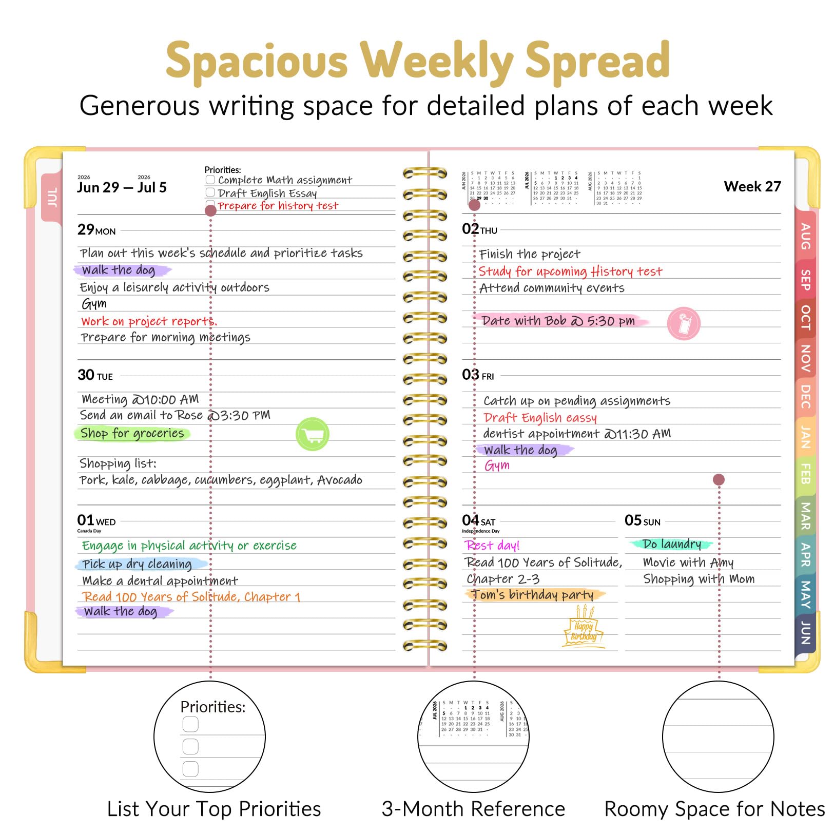 2026 Planner with Simple Layout: Come with 12 months (Jan 2026 - Dec 2026) of monthly and weekly pages, plus 3 additional monthly pages (Oct 2025 - Dec 2025), helping you plan ahead right now! This calendar planner features a simplified layout for ease of use, offering spacious writing space to plan your schedule freely. The elegant design with attention-grabbing colors, adds a touch of sophistication to any setting!