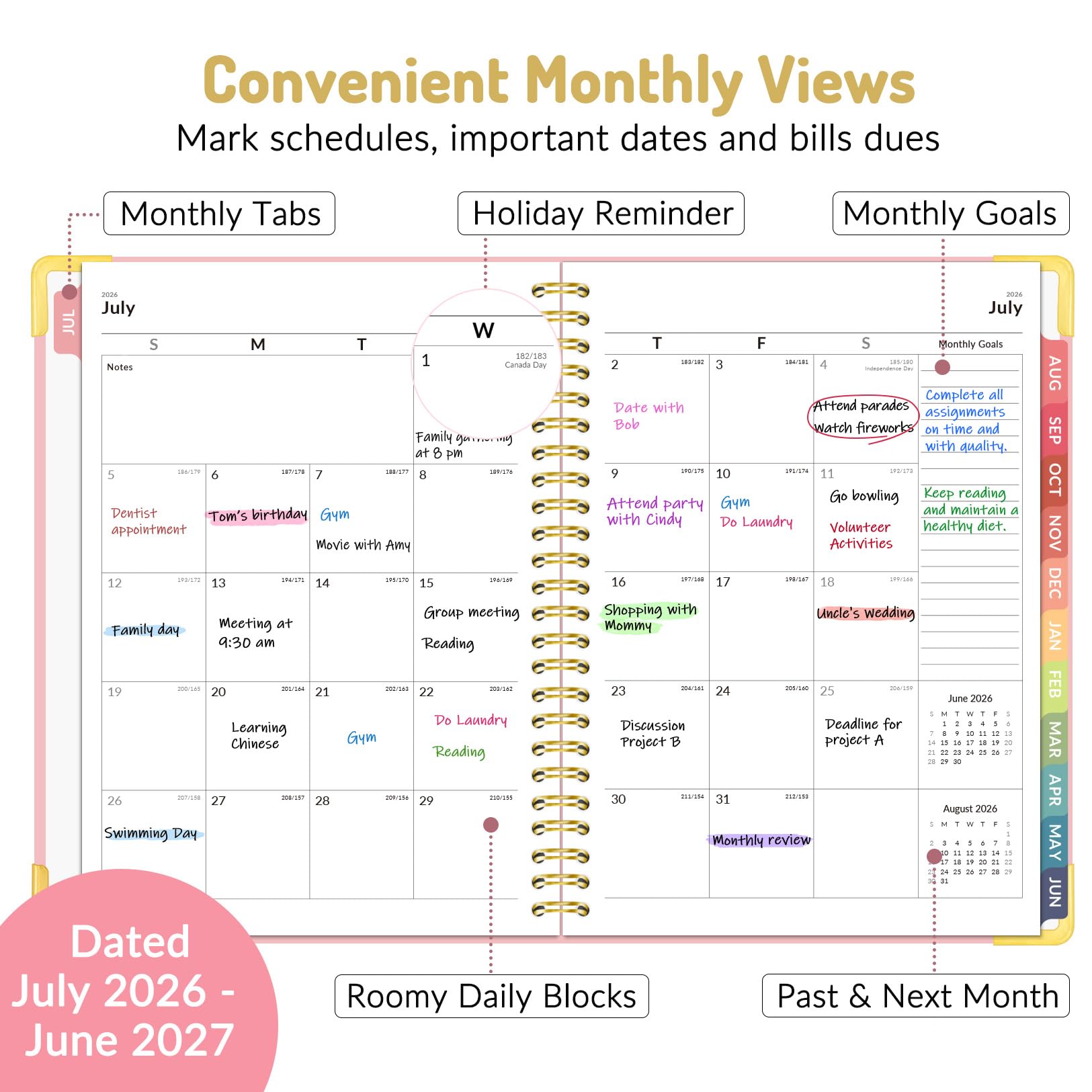 Upgraded Quality: Unlike other flimsy planners, our calendar planner features a sturdy hard cover with metal corner guards to prevent pages from creases or wrinkles. Monthly tabs for simplify navigation are laminated to resist tears. Thick, no-bleed paper for easy writing