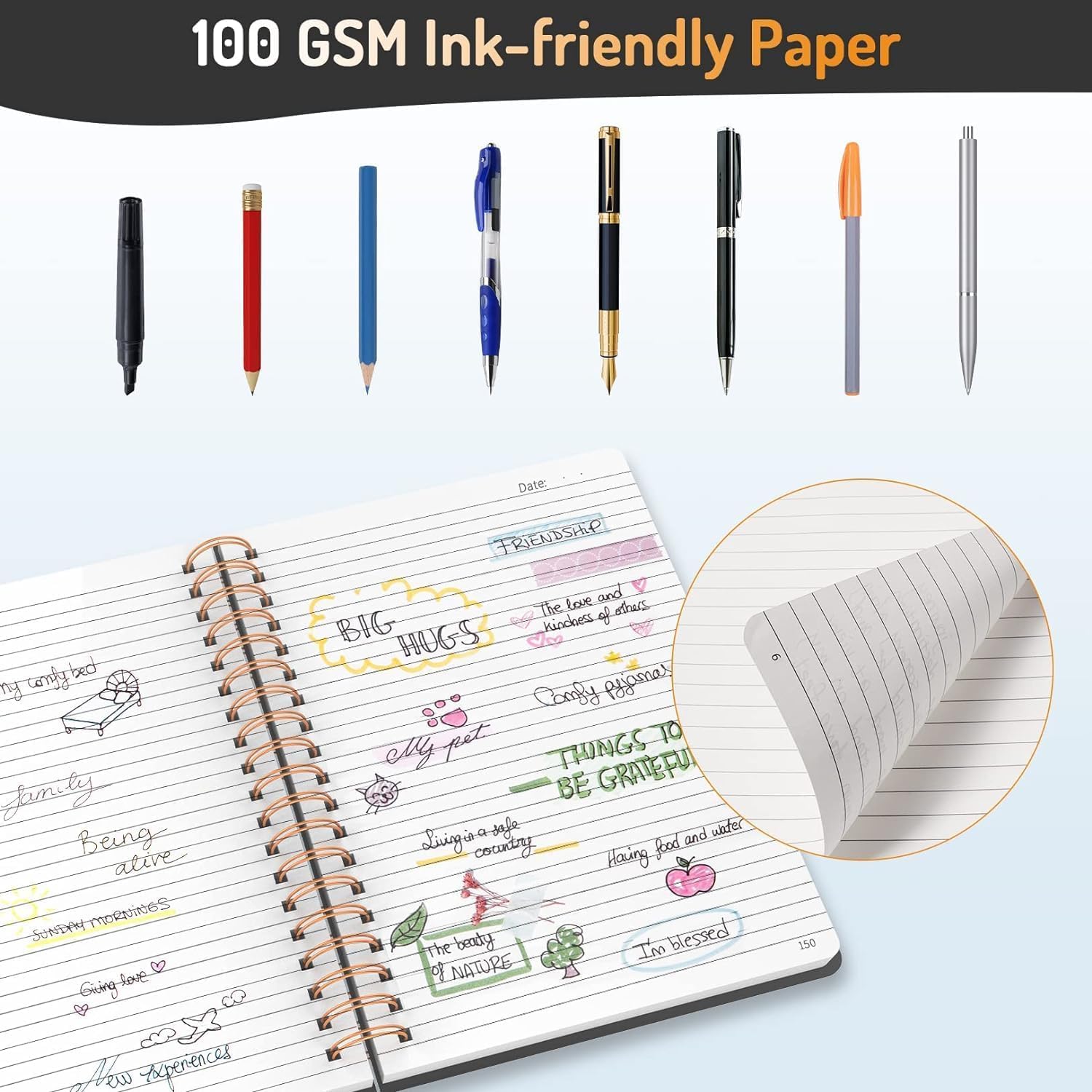 100 GSM Ink-friendly Paper: The pages are very thick which avoids ink bleeding through and ghosting. Suitable for most pen types, such as ballpoint pens, fountain pens, gel pens, pencils and so on. Allowing you to write on both sides of every page to maximize your usable space.