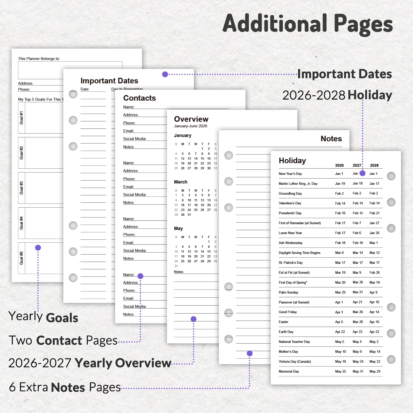 Additional Functional Features: 2026-2027 Yearly Overview | Yearly Goals | Important Dates | Contact Pages | 2026-2028 Holidays | 6 Extra Notes Pages
