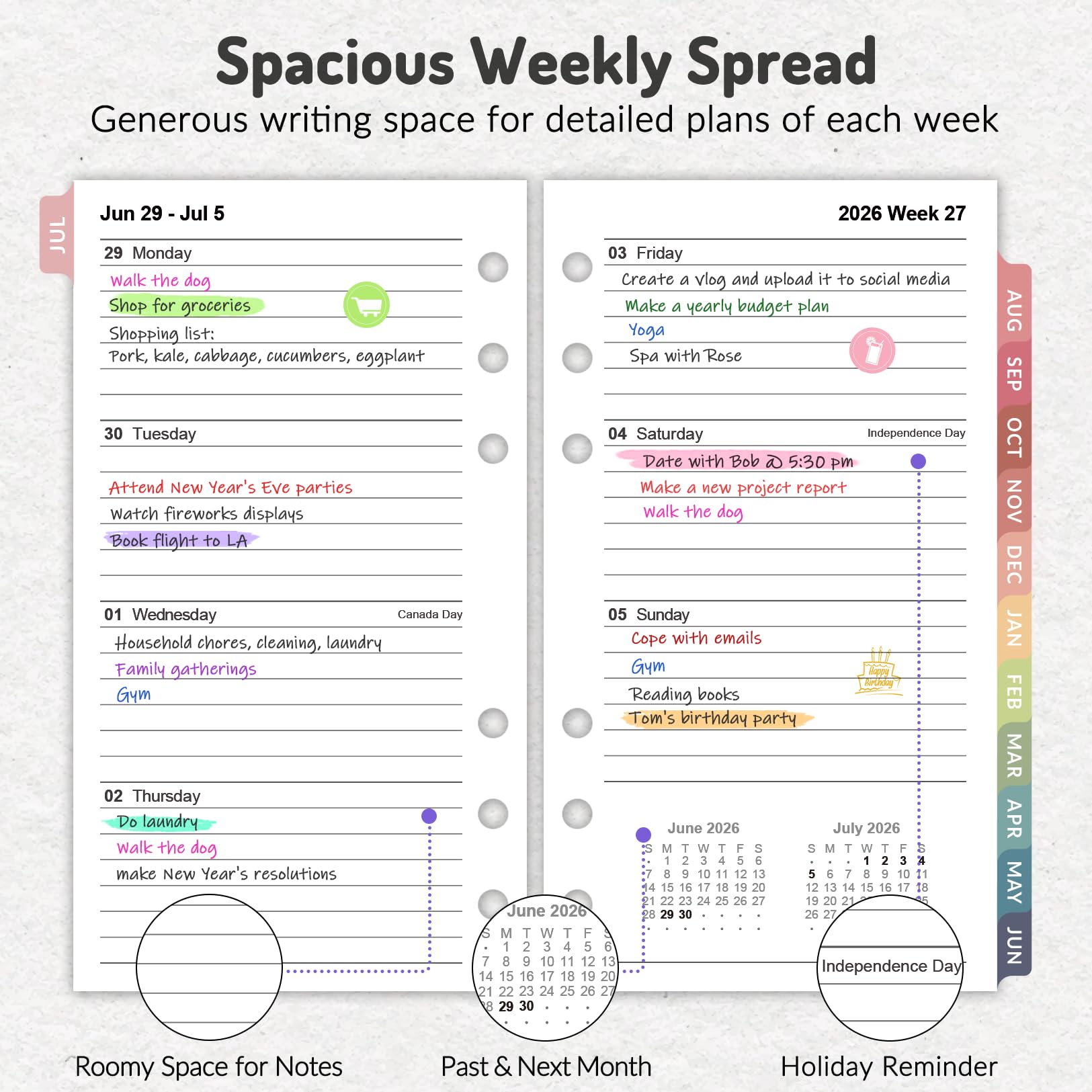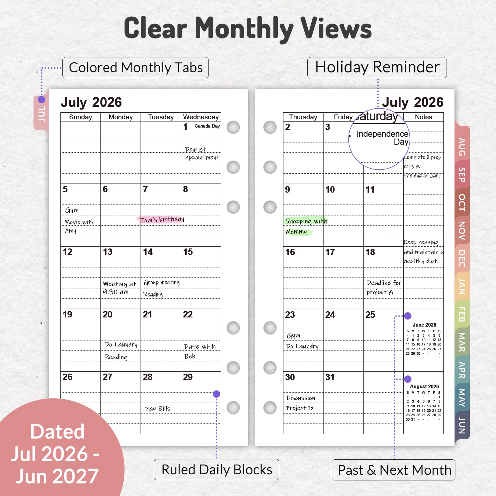 2026 Planner Refills with Colorful Monthly Tabs: Come with 12 months (July 2026 - Jun 2027) of monthly pages, plus 3 additional monthly pages (April 2026 - June 2026), helping you plan ahead right now! Monthly tabs for simplify navigation are laminated to resist tears