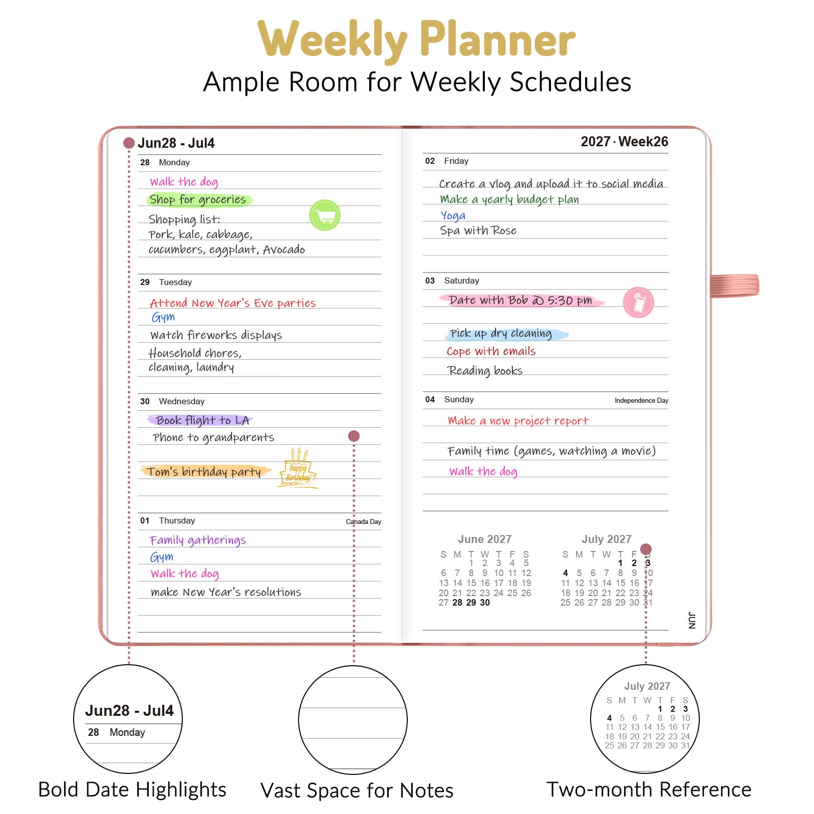 2026-2027 Pocket Planner: Covering July 2026 - June 2027, this small planner offers 12 months of weekly and monthly layouts, ideal for a new academic year. Its hardcover design ensures durability, while the elastic band keeps it secure and doubles as a bookmark. Future planning sections for 2027 - 2028 keep your to - dos organized(Extra monthly pages for March-May are included. )