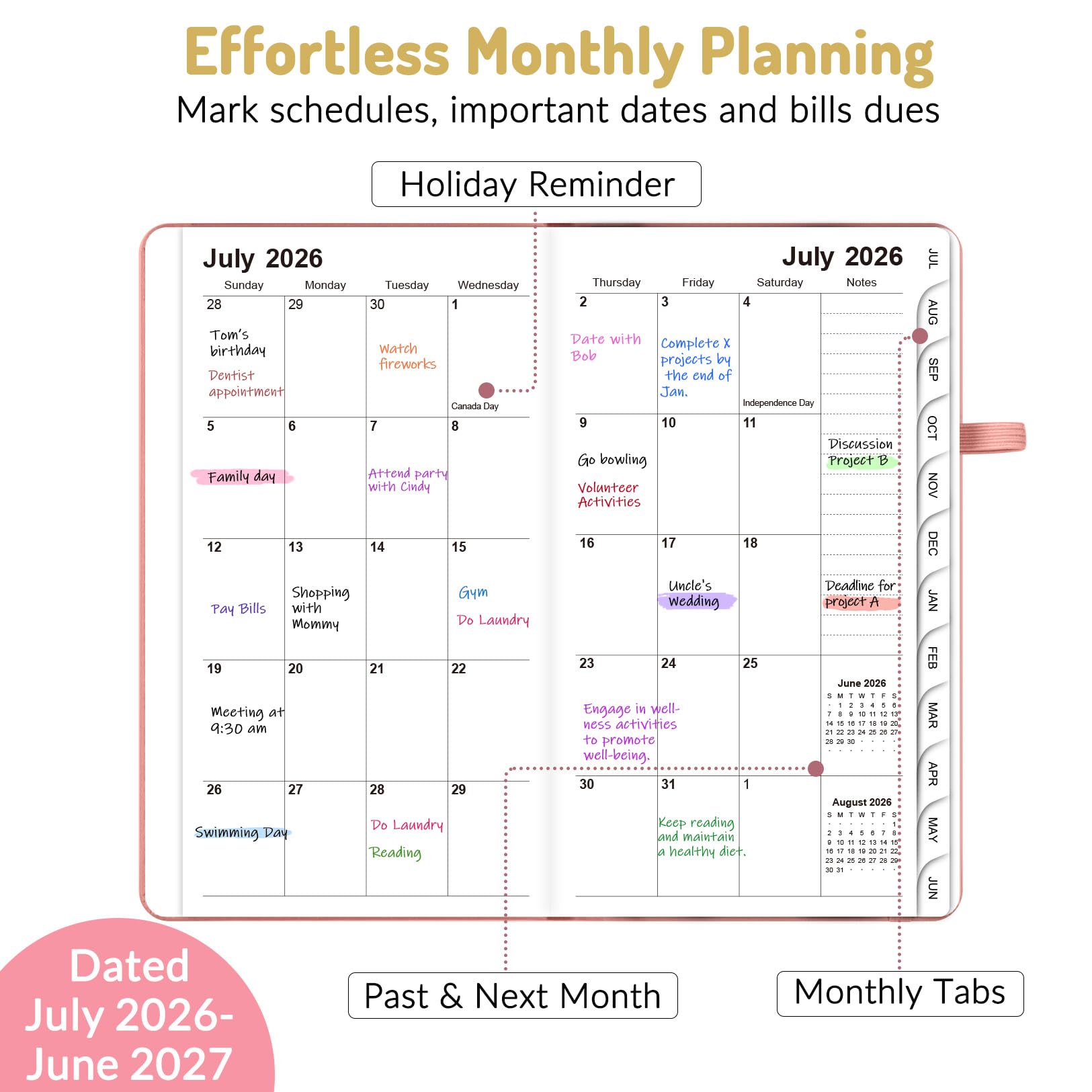 Weekly View: The week on two-page spreads is helpful for facilitates detailed planning. With ample lined writing space, holiday reminders, 2-month calendars for references, and monthly tabs, this 2026-2027 agenda allowing you to track your daily appointments, and weekly planning