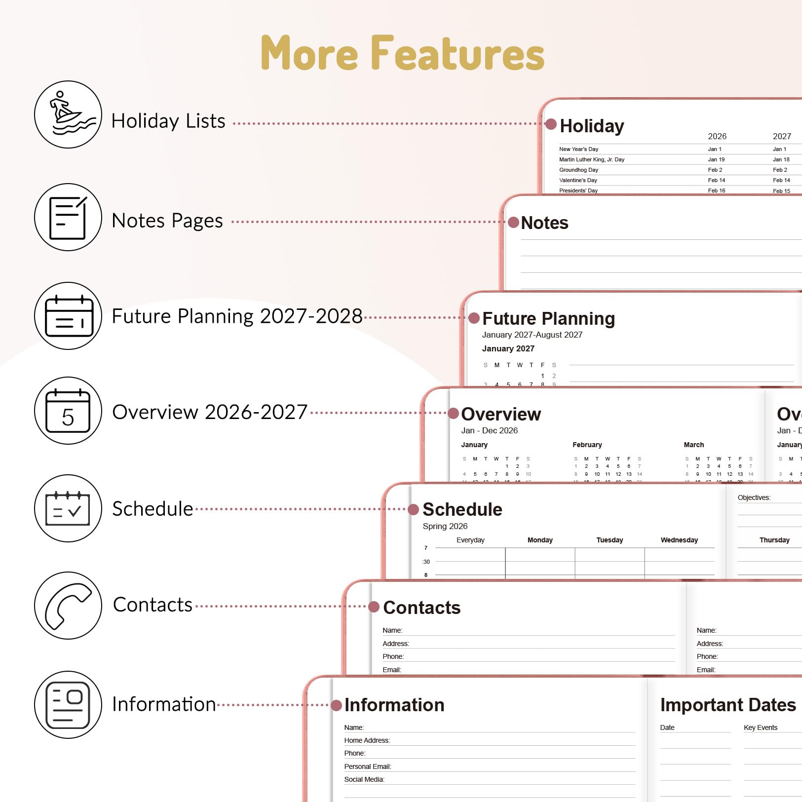Extra Feature Pages: The 2026-2027 planner offers extensive planning pages—including personal info, important dates, contacts, schedules, a 2026 to 2027overview, notes, and holidays. It's the perfect tool to inspire and organize your life, work, or studies, ideal for everyone from students to professionals