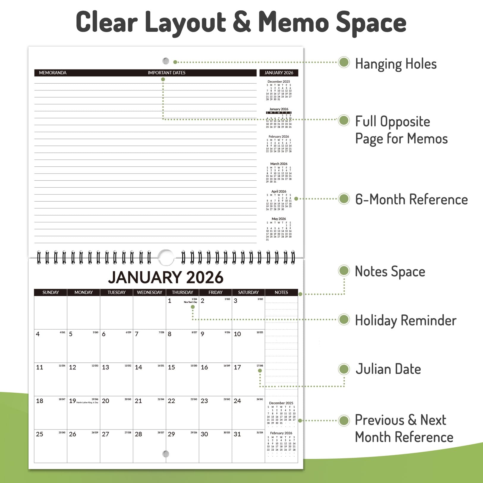 Clear Layout with Full Page Memo Space: Features a 6-month overview and a giant notes section on the reverse. The front offers an organized monthly view, complete with holiday markings, previous/next month previews, and a practical date countdown
