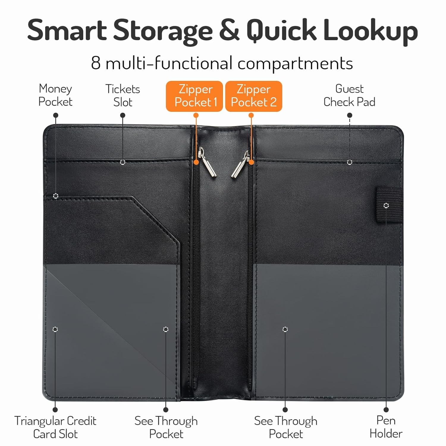 Smart Storage & Quick Lookup: 8 multi-functional compartments. On the right side has a check pad, and on the other has a Money Pocket, Tickets Pocket and Credit Card Slot. Two small clear pockets can store bills, receipts and other items to be viewed. A stitched pen loop to store your favorite pen.