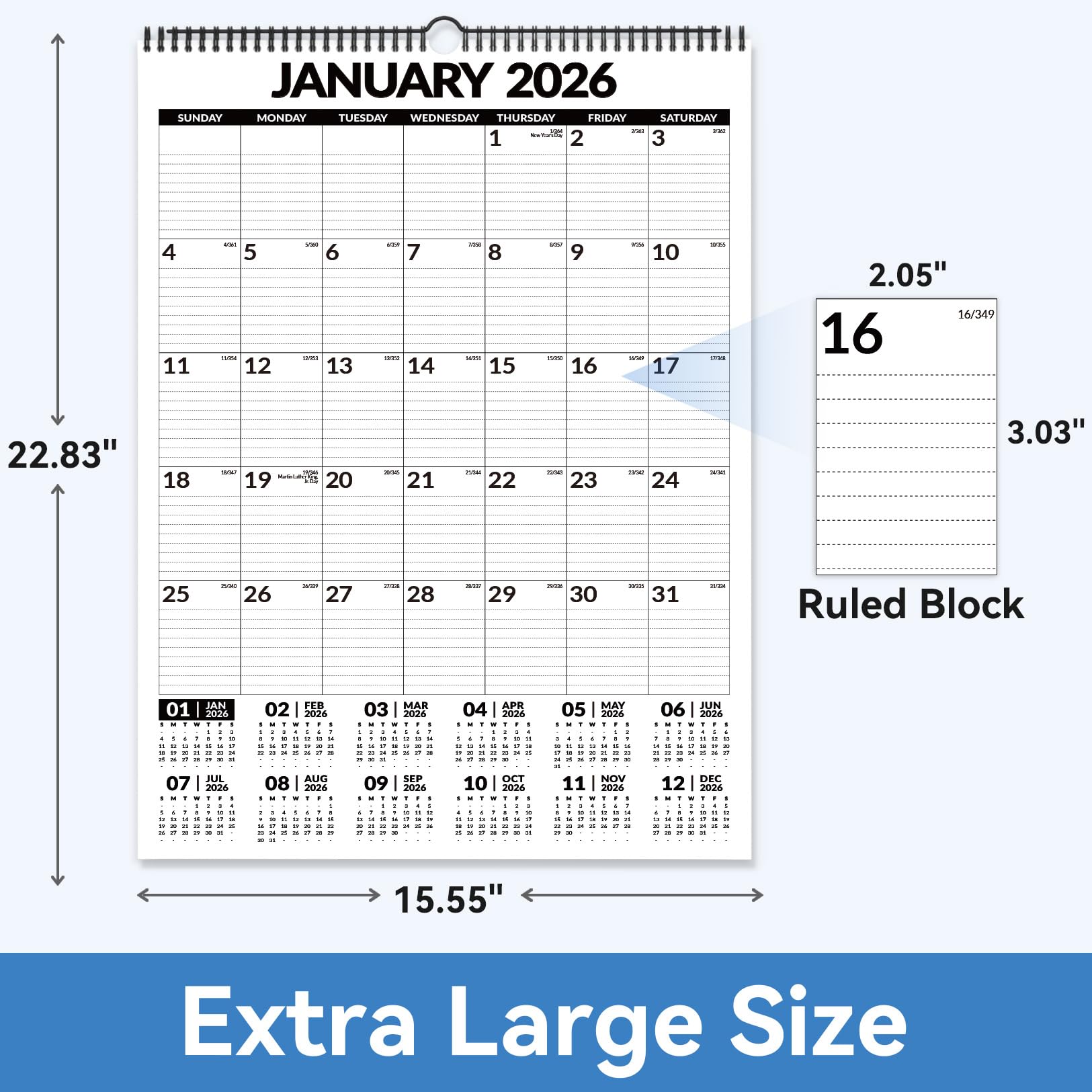 Extra-Large Size with Ample Writing Space: At 15.5" x 22.8", this calendar provides oversized daily grids with lined writing areas (2" x 3"). Perfect for busy families, professionals, and students to organize appointments, goals, and activities