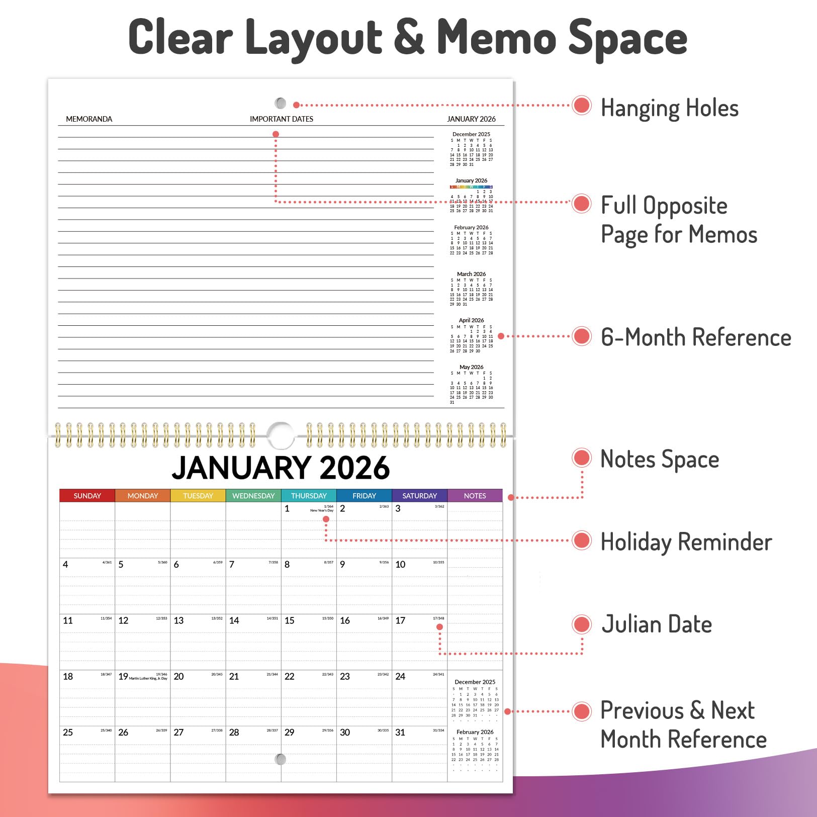 Clear Layout with Full Page Memo Space: Features a 6-month overview and a giant notes section on the reverse. The front offers an organized monthly view, complete with holiday markings, previous/next month previews, and a practical date countdown