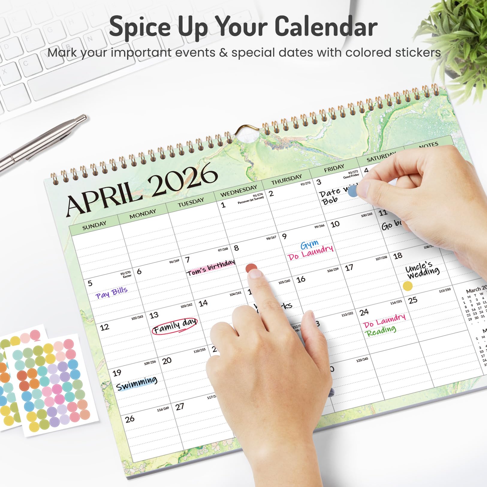 Spacious Writing Blocks & Colored Stickers: Each day offers a 1.61" x 1.77" ruled block for jotting down appointments, reminders, or family schedules. Comes with 2 sheets of round colored stickers (96 pieces total) to mark special dates or events
