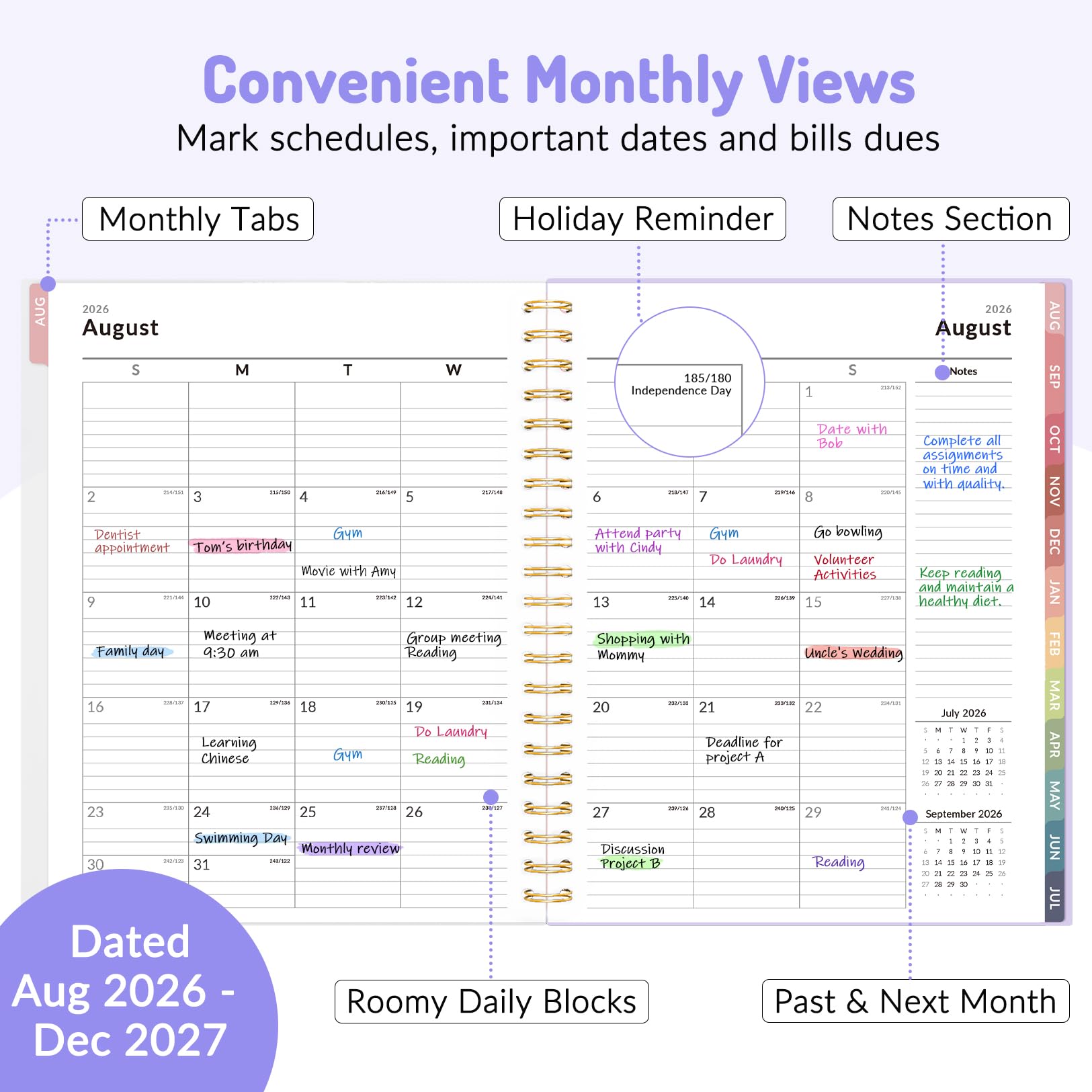 Planner 2026-2027: Come with 17 months (Aug 2026 - Dec 2027) for easy jotting down of events, appt, deadlines and meetings that are scheduled way in advance. Plan ahead! Includes 3 additional monthly pages (May 2026 -July 2026), so you can start organizing early. Perfect for anyone planning around school.