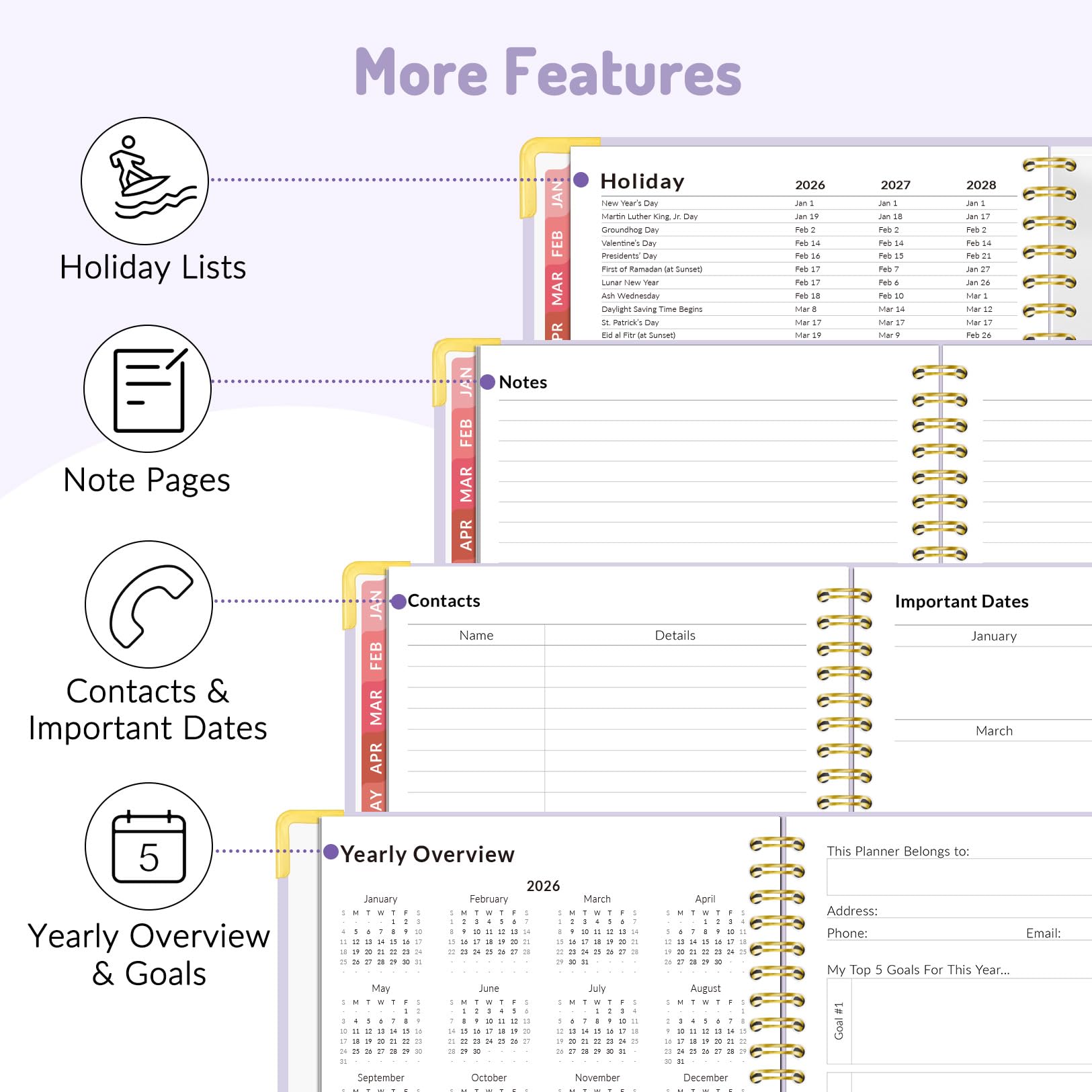 Extra Functional Pages: This agenda planner 2026 starts with Yearly Goals page for setting your goals. It also includes reference calendars, contact page, important dates page and holiday lists to keep on top of your special dates. Bonus extra notes pages to capture your thoughts or ideas