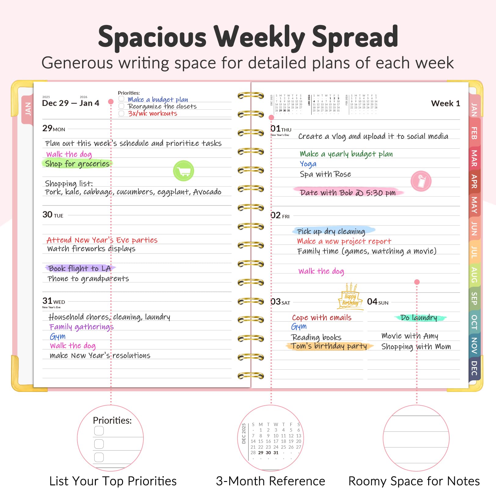 Colored Tabs for Easy Navigating: The monthly tabs make it easy to jump where you need to go when you flip it open—a good design for busy people, student teacher who want to track things day by day.