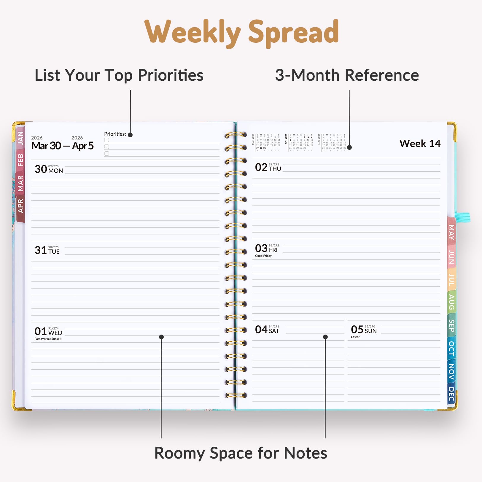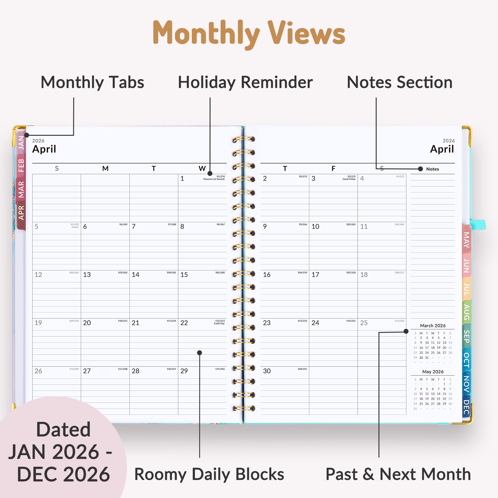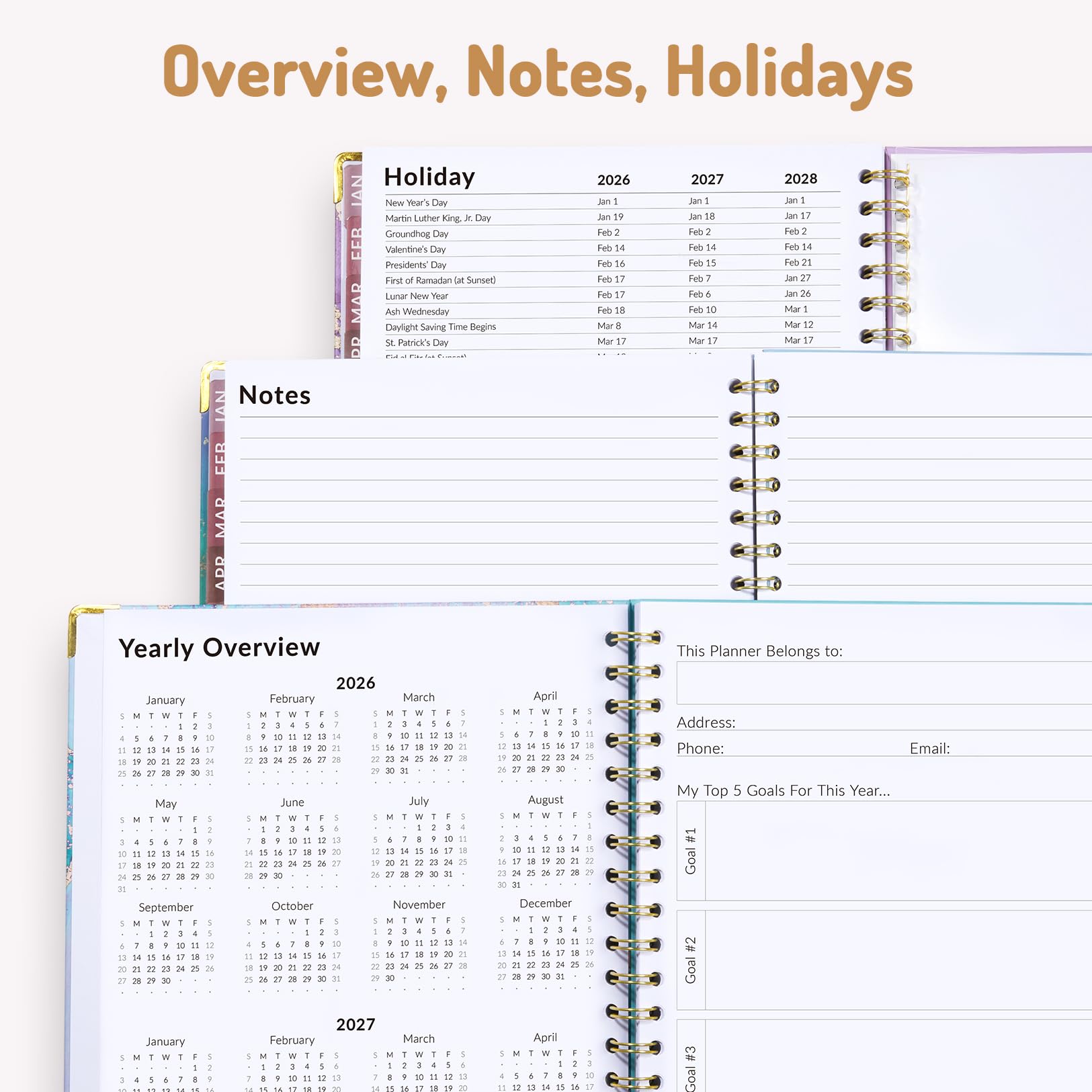 Additional Planner Pages for Easy Organization: The planner offers reference calendars for 2026-2028, annual goals, holiday list, contacts, important dates and note pages. Helps you in planning ahead and adjusting plans as needed to accommodate changes.