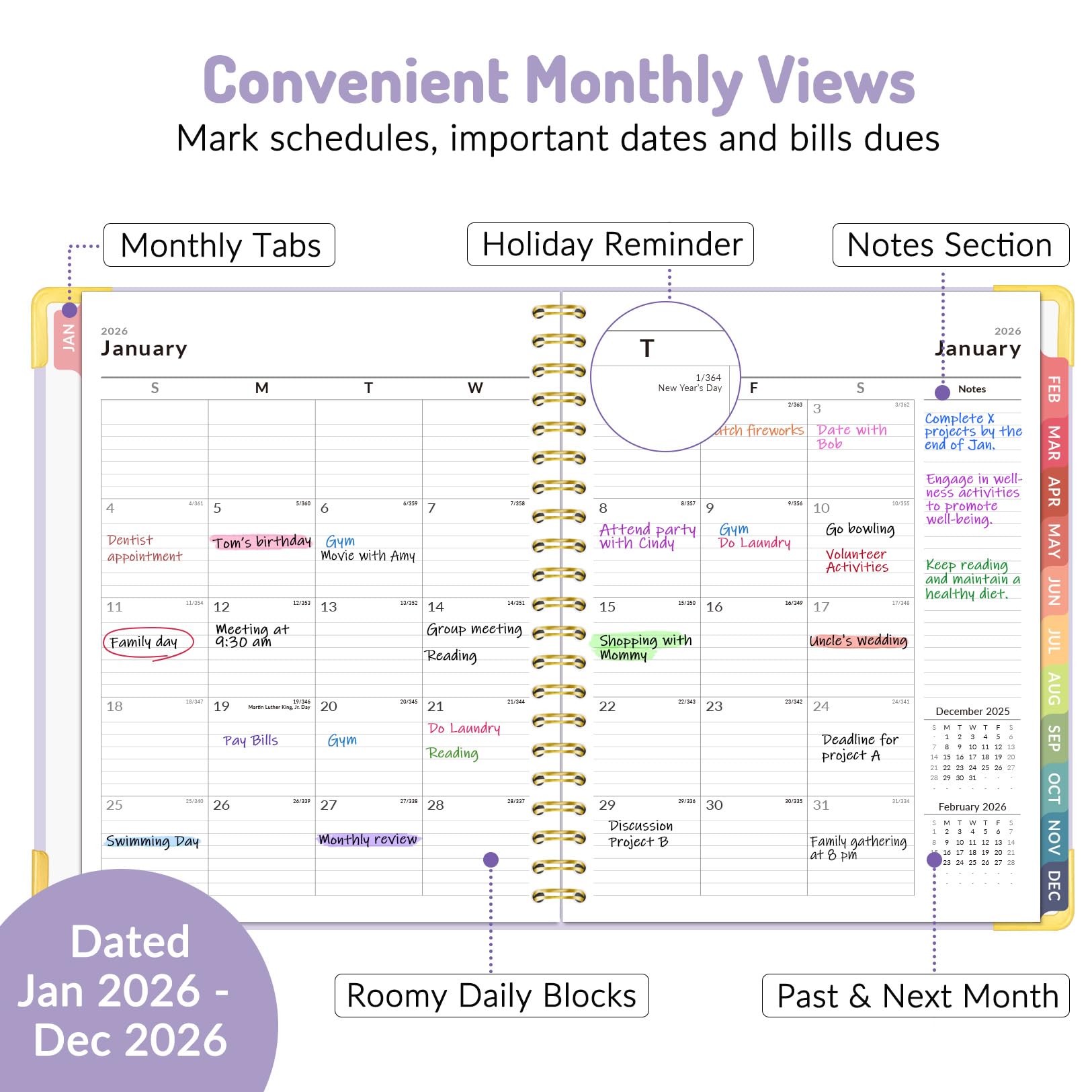 2026 Planner Overview: Covering 12 months from January 2026 to December 2026, our planner helps you take on the fresh year with confidence. The simple layout ensures easy navigation and provides generous writing space for your schedules. With its sophisticated design and striking colors, it adds a touch of elegance to your desk or workspace