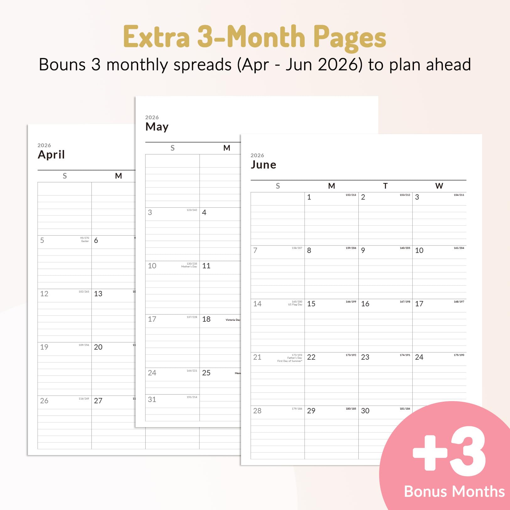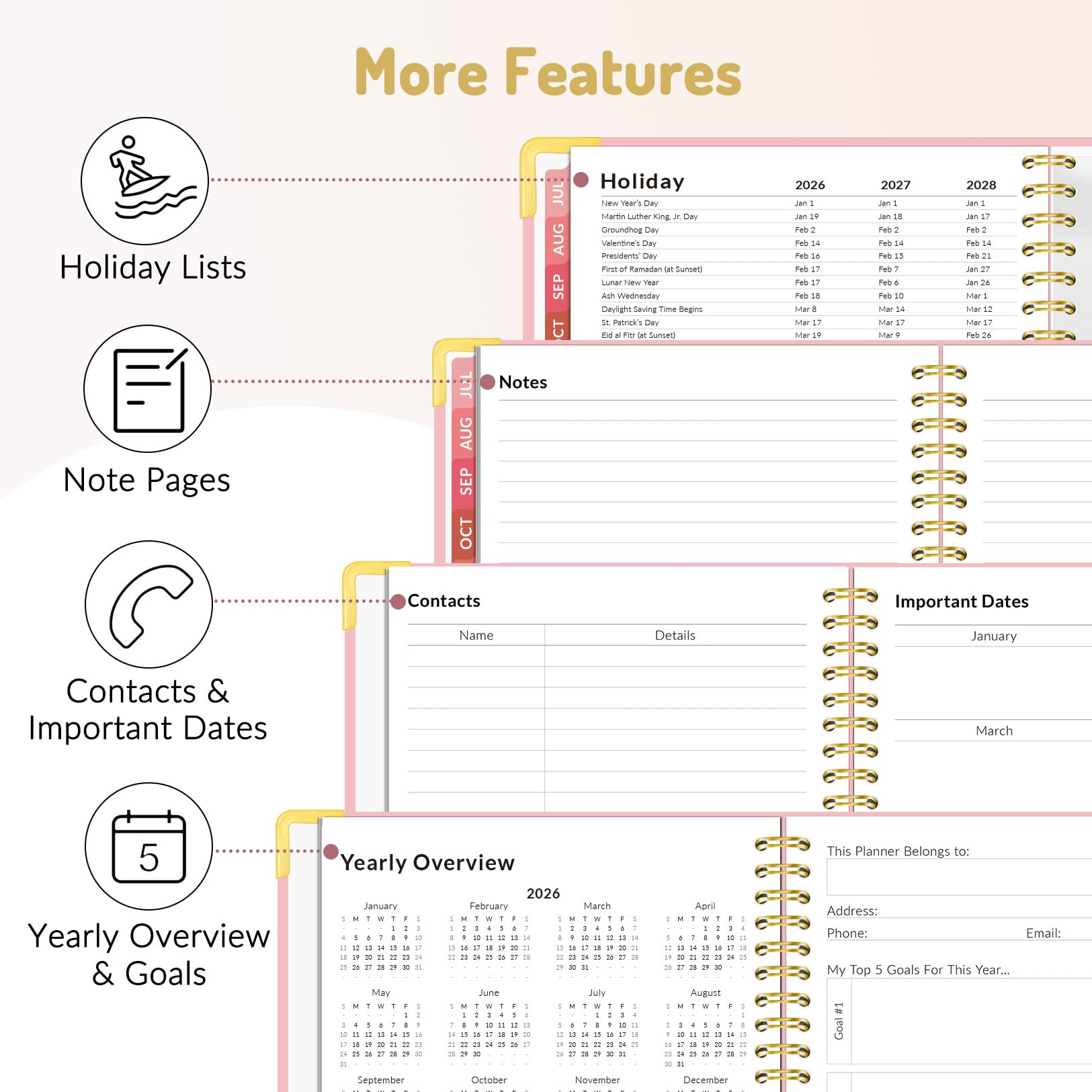 Additional Planner Features: This calendar planner starts with Yearly Goals page for goal setting. It also includes reference calendars, contact page, important dates page and holiday lists to keep on top of your special dates. Bonus extra notes pages to jot down your thoughts.