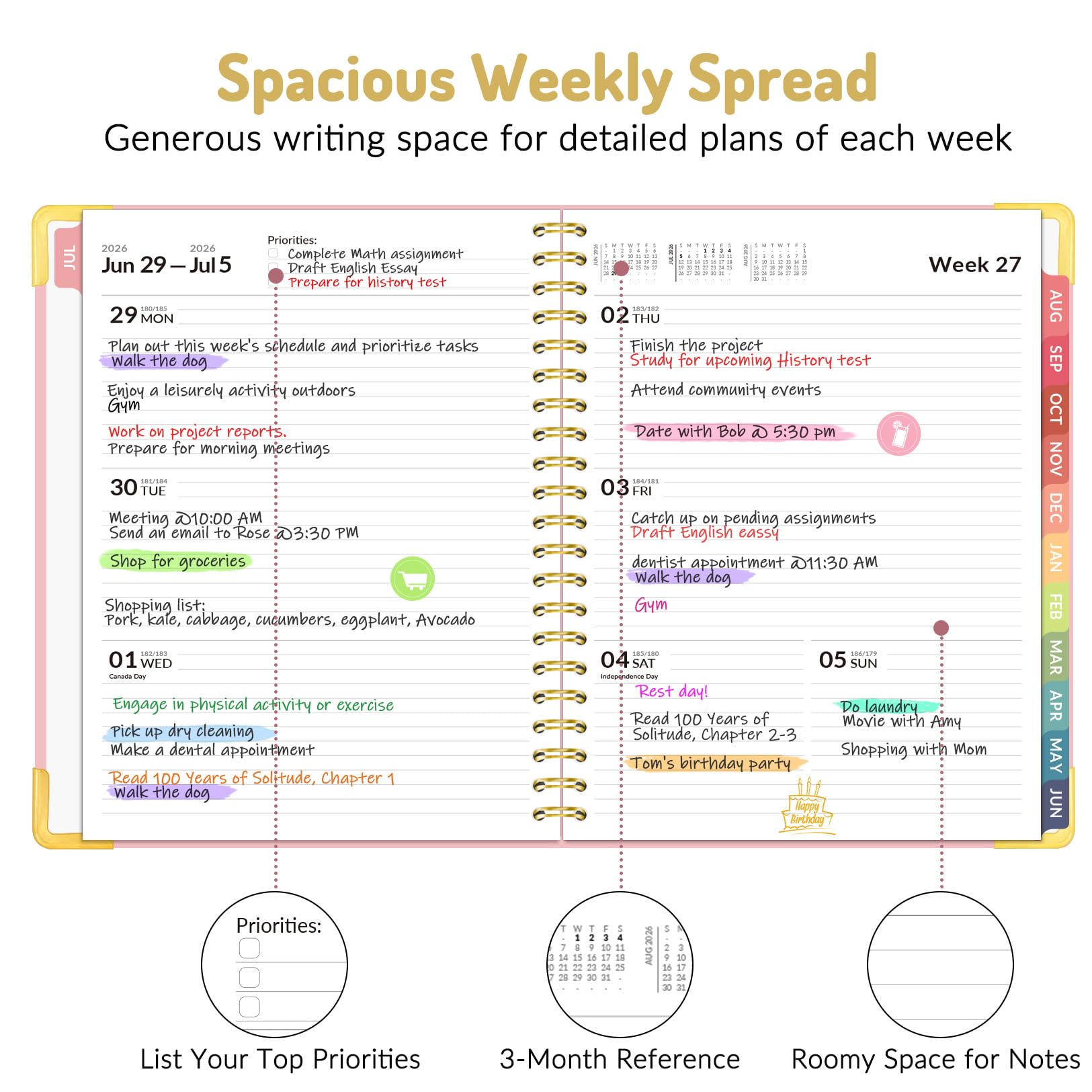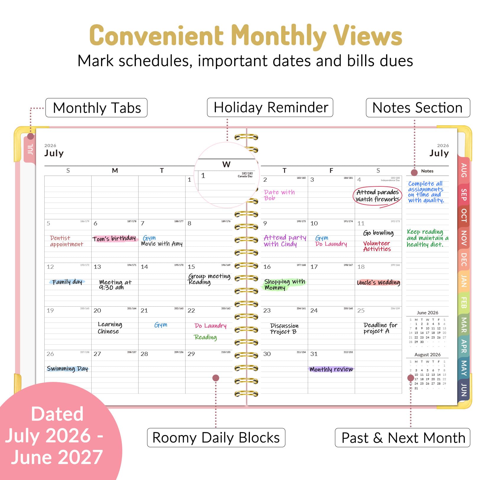 2026 - 2027 Academic Planner: Come with 12 months (July 2026 - June 2027) of monthly and weekly pages, plus 3 additional monthly pages (Apr 2026 - Jun 2026), providing a fresh start for a school year! This agenda planner features a simplified layout for ease of use, offering spacious writing space to plan your schedule freely. The elegant design with attention-grabbing colors, adds a touch of sophistication to any setting!