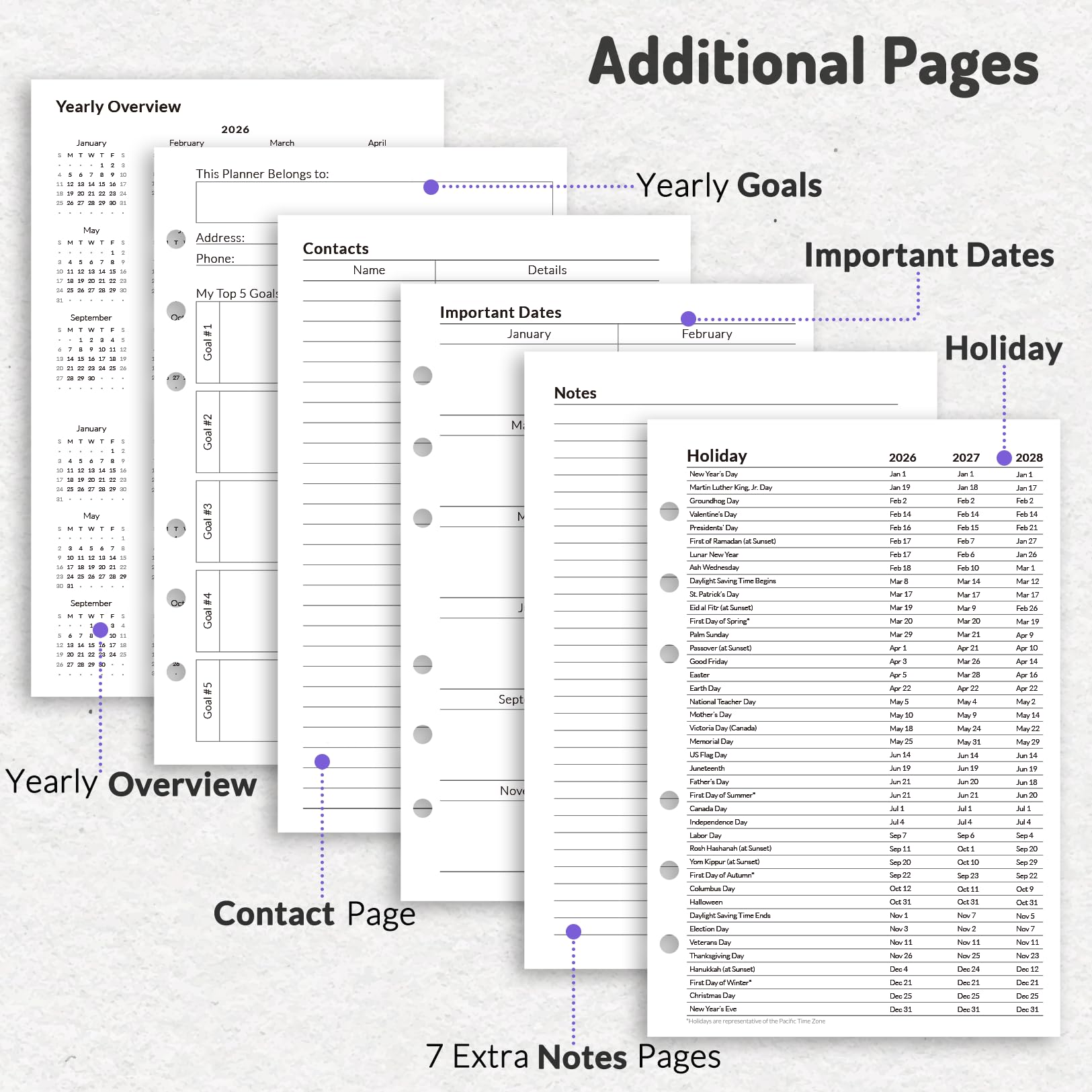 Additional Functional Features: 2026-2027 Yearly Overview | Yearly Goals | Important Dates | Contact Pages | 2026-2028 Holidays | 7 Extra Notes Pages