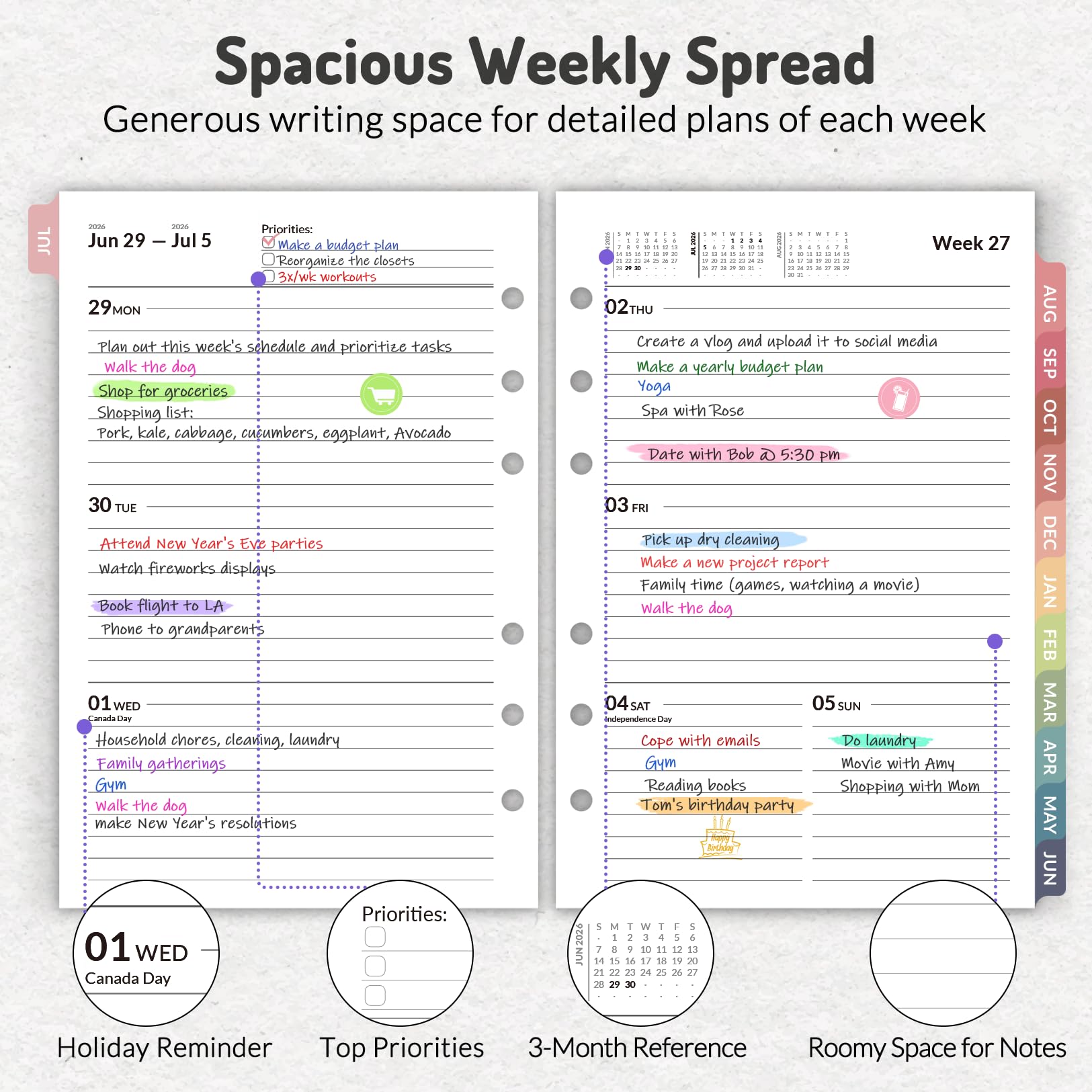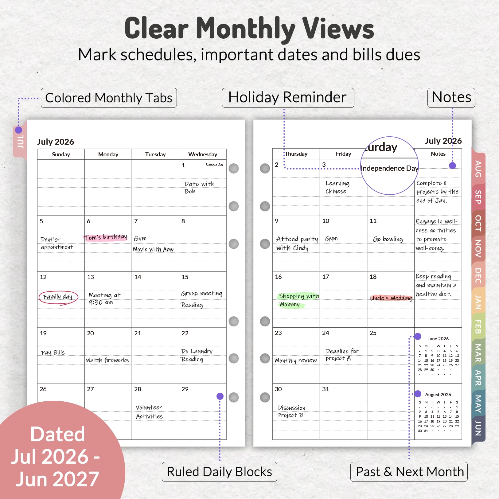 2026-2027 Planner Refills with Colorful Monthly Tabs: Come with 12 months (July 2026 - Jun 2027) of monthly pages, plus 3 additional monthly pages (April 2026 - June 2026), helping you plan ahead right now! Monthly tabs for simplify navigation are laminated to resist tears