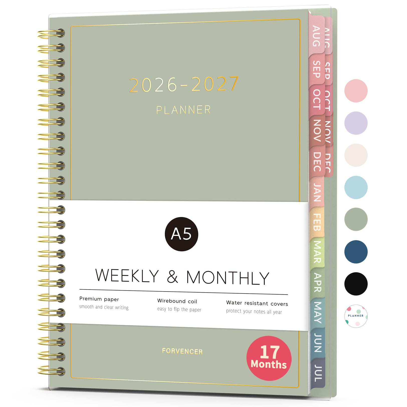 Aug 2026 - Dec 2027 Planner, Forvencer 17 Month Academic Planner 2026-2027, 6.3" x 8.4", Calendar Planner Weekly and Monthly, Daily Agenda Book, College School Supplies for Student Teacher, A5, Green