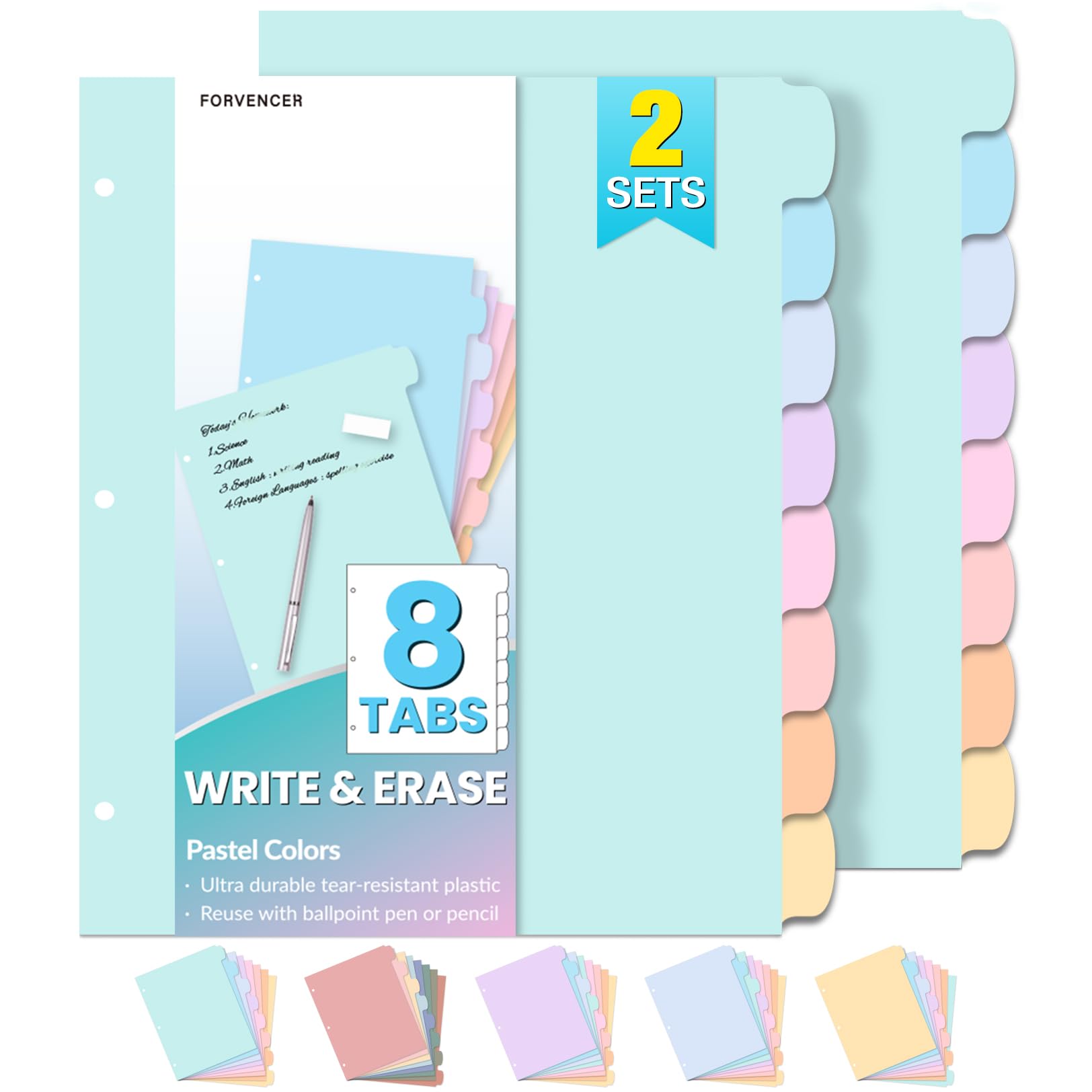 Forvencer 8-Tab Binder Dividers with Tabs, 2 Sets Write&Erase Plastic Dividers for 3 Ring Binder, Durable Binder Tabs for Organizers, 3 Ring Binder Dividers with Tabs for School Office, Pastels